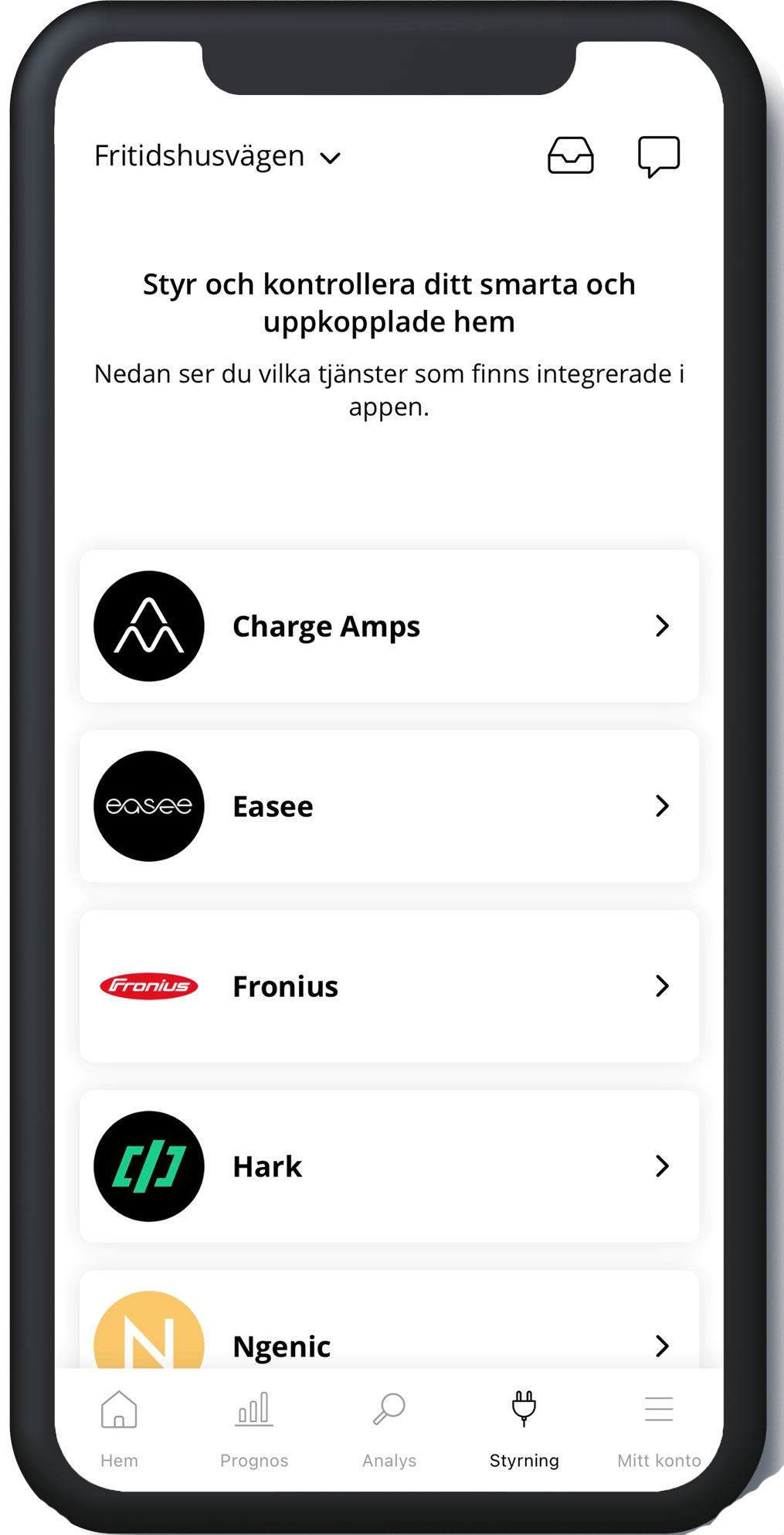 Värm upp din bostad när elpriset är som lägst och styr belysning och andra smarta prylar i hemmet genom appens smarta integrationer med Ngenic, Nibe Uplink och Telldus