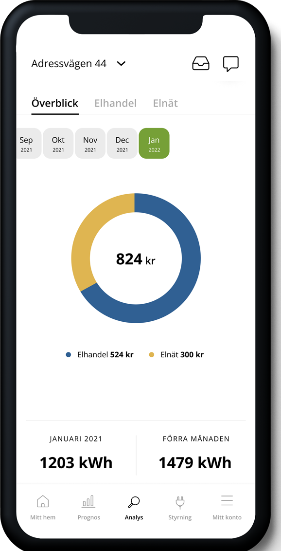 I appens analysvy kan du grotta ner dig på detaljnivå om ditt hushålls elanvändning, kostnad, förbrukning, klimatpåverkan och produktion. Här kan du också jämföra din elanvändning med dina grannar och spana in vem som är energismartast.