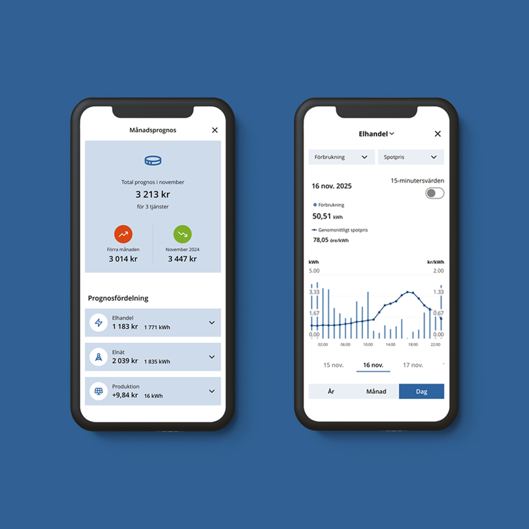 bild av din elanvändning. Du kan se hur kostnaderna fördelas över dygnets timmar, jämföra med tidigare månader och år samt få en känsla för hur du ligger till i förhållande till dina grannar – och mycket mer.