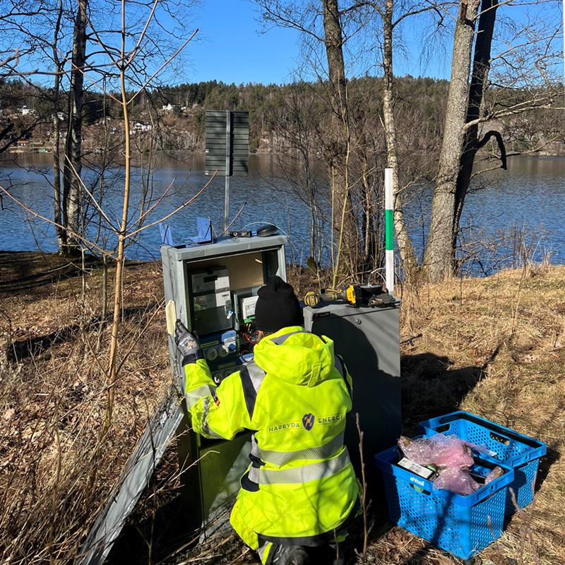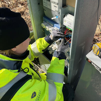 Just nu arbetar vår distributionselektriker Johan tillsammans med vår LIA-praktikant Julia med att uppgradera våra 186 belysningscentraler runt om i kommunen till 5G. Det innebär att den styrenhet som sitter i respektive belysningscentral byts ut till en ny modernare version som kommunicerar via 5G. Styrenheten har även en inbyggd givare som känner av när lamporna ska tändas och släckas. När varje enhet är på plats ska den testköras så att kommunikationen fungerar. När arbetet är klart kan vi vara trygga med att våra gatorna fortsätter vara upplysta och trygga under årets mörka timmar!