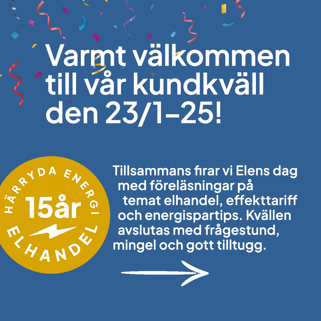 Varmt välkommen att fira Elens dag med oss på vår kundkväll torsdagen den 23/1-25. Vi bjuder på gott tilltugg och dryck till inspirerande och nyttiga föreläsningar på ämnet elhandel,effekttariff och energispartips.