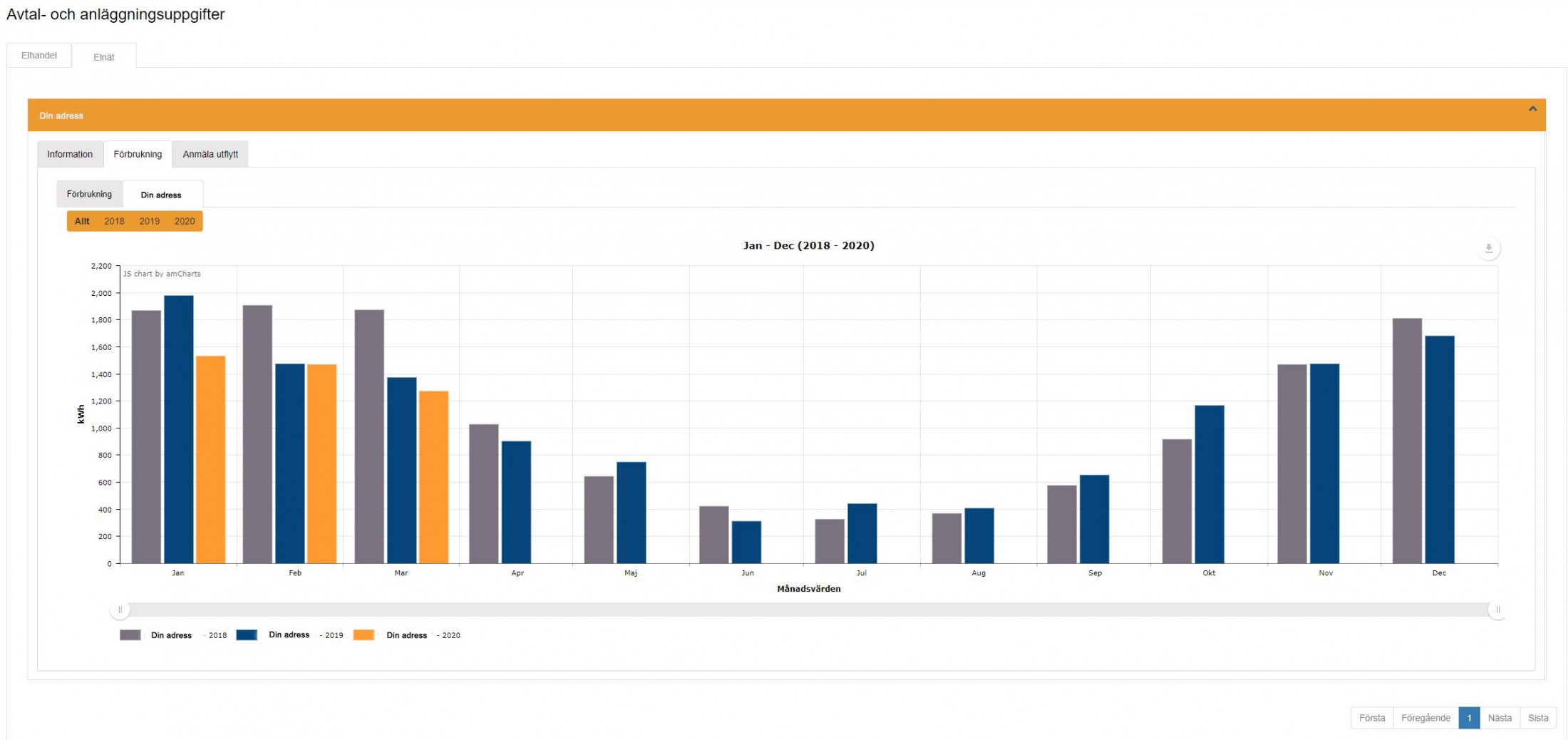 Nu ser du din månadsförbrukning i stapeldiagram och kan jämföra dem mot de senaste två årens månadsförbrukning månad för månad. När du håller muspekaren över en stapel ser du antalet kWh du har använt. Klicka på stapeln och du får upp din elanvändning dag för dag denna månad.