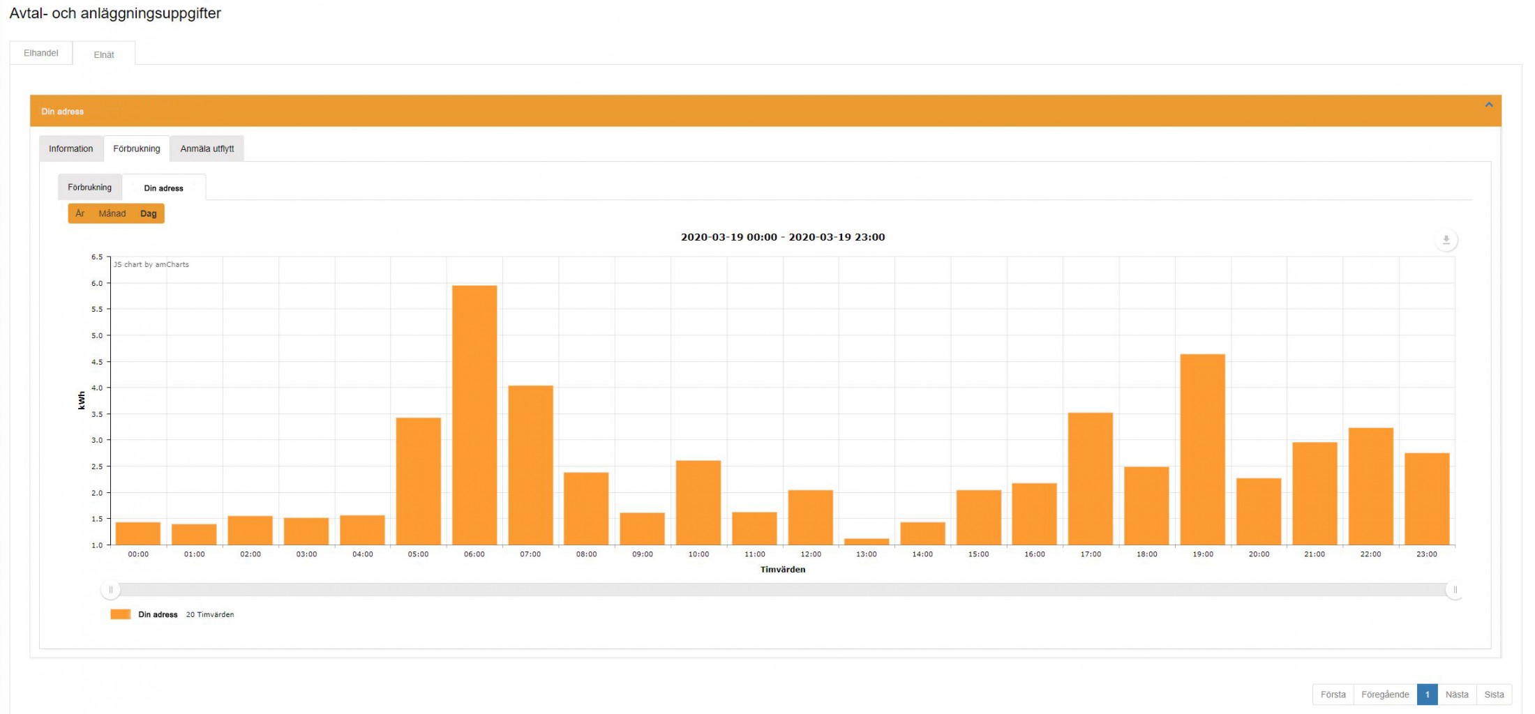 För att se din timförbrukning, följ instruktionerna för att se din förbrukning och klicka sedan på den stapel för den dag du är intresserad av. Nu ser du en vy med dina timvärden för denna dag. För att byta dag, gå tillbaka till månadsvyn och klicka på stapeln för en ny dag.